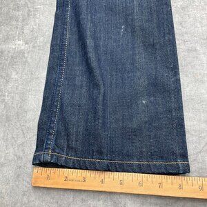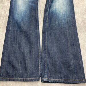 Express ReRock bootcut jeans in distressed blue for women, size 6. Featuring stitched pockets with a flap detail. Crafted from stretch cotton for comfort and style.