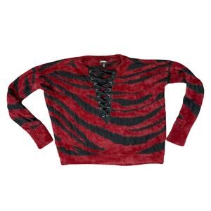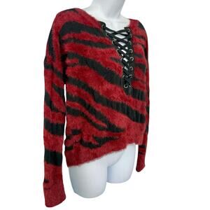 Express Red Black Tiger Stripe Lace Up V-Neck Fuzzy Eyelash Crop Sweater Size XS