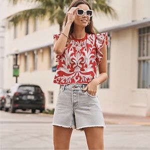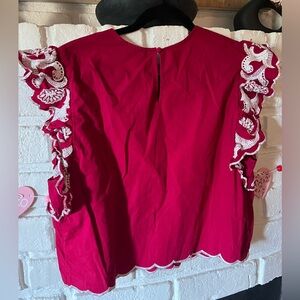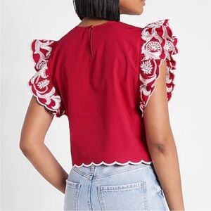 Express Red Embroidered Ruffled Top, Size Large