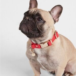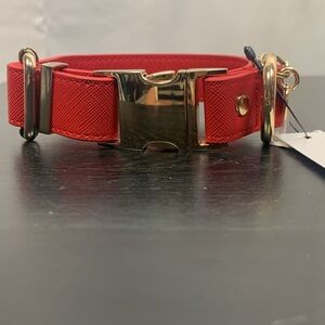 Adorable red faux leather dog collar with brilliant gold hardware. Pamper you pet with the gift of style!