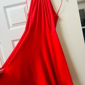 This vibrant red sundress from Express is designed for a night out, featuring a sleeveless halter neckline that exudes elegance. Its flowing fabric creates a sleek silhouette, making it a standout piece for any cocktail occasion. The bold color and classic cut ensure a timeless appeal.