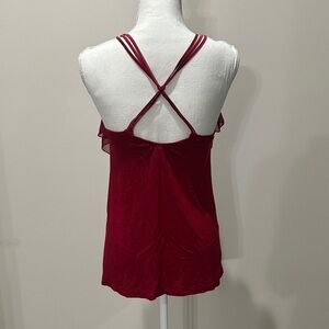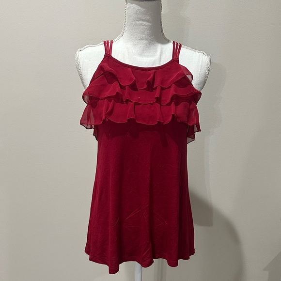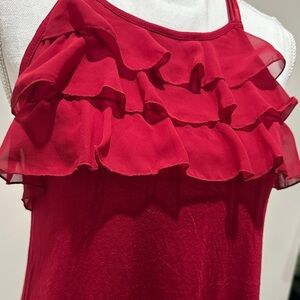 Chic red blouse with layered ruffles. Perfect for stylish outings. Tiny pinhole at bottom which is hard to see.