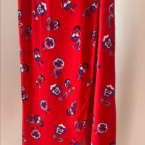 This stunning red maxi skirt from Express features a chic A-line silhouette with a high-low hem and a stylish slit, perfect for casual or resort wear. The vibrant red color is complemented by subtle black accents, creating a striking look. Crafted from a lightweight fabric, it offers a flowing fit that moves beautifully with every step.