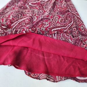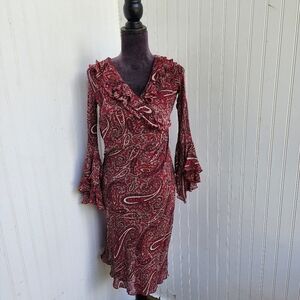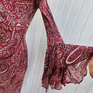 Express Red Paisley 100% silk Ruffle neck Flounch Sleeves Cinch Waist Dress 1/ 2
