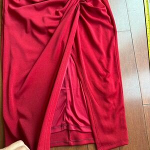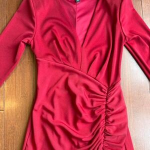 Express red long sleeve ruched bodycon dress with front slit and shoulder pads #bodycon #ruched #formal #occasion