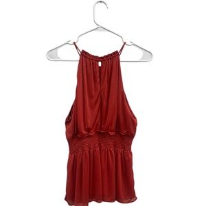 This vibrant red sleeveless blouse from Express features a stylish halter neckline with ruffled detailing. The soft, drapey fabric and relaxed silhouette make it a perfect choice for a casual yet chic look. The defined waistline adds a flattering touch to this elegant top.