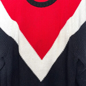 Express red & black knit pullover sweater. In excellent condition! Crew neckline. Long sleeves. Fitted cuffs. Step bottom hem. High slits on hem. Oversized fit. Heavyweight knit material. Red & black with a white V in the middle. Size large.