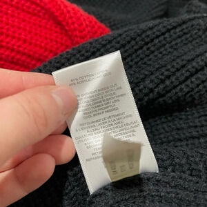 Express red & black knit pullover sweater. In excellent condition! Crew neckline. Long sleeves. Fitted cuffs. Step bottom hem. High slits on hem. Oversized fit. Heavyweight knit material. Red & black with a white V in the middle. Size large.