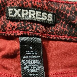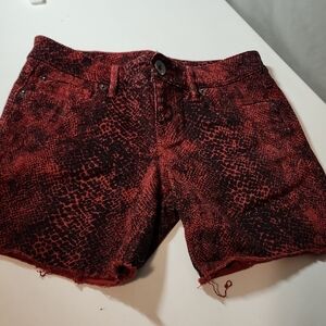 These Express jean shorts feature a striking red and black color scheme with a baroque-inspired pattern, perfect for adding a touch of elegance to your casual wardrobe. The intricate design offers a unique and stylish look, making them ideal for any casual outing.