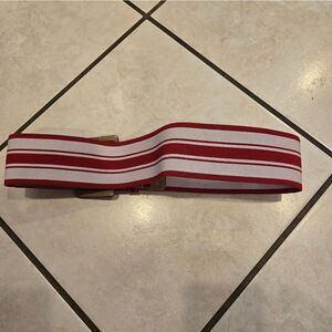 Stylish red belt with white stripes. Features a bold buckle. Perfect for adding flair to any outfit.