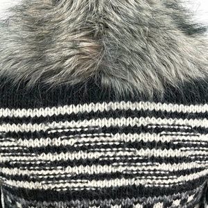 The knit features stripes of white, grey, black, and just a touch of silver.