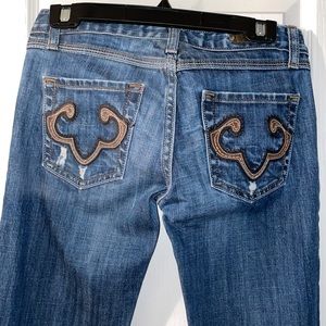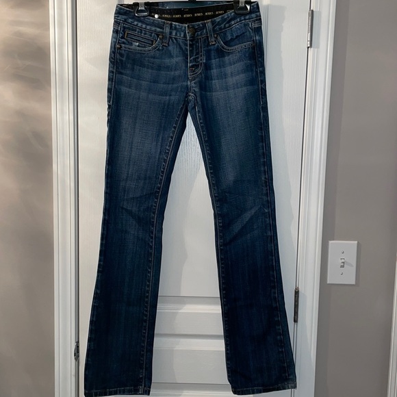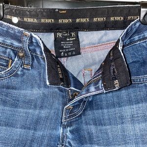 Express Rerock women’s bootcut jeans, size is 2, front zipper is broken, color is dark denim, condition is slightly worn with a broken zipper, material is cotton and spandex.