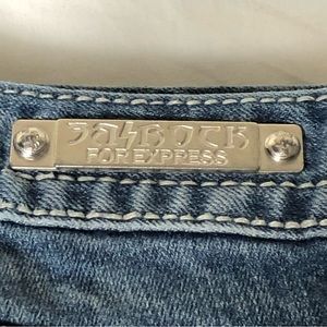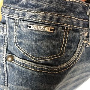 Low-rise bootcut jeans. Distressed style. Minor fraying on bottom. Otherwise in excellent condition.