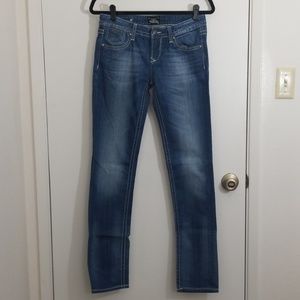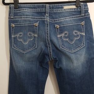 Style is officially classified as skinny, which I don't understand because they look barely boot cut. Style is from REROCK for EXPRESS collection. Medium to light wash denim with thick, light colored stitching. Worn maybe once if ever at all.
