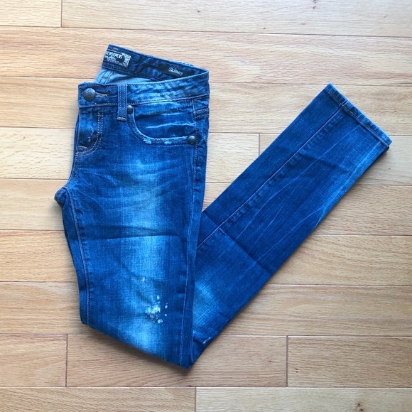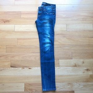 Rerock Jeans for Express. They’re a skinny leg fit in a medium to dark wash with a little distress throughout. I wore them once or twice, they’re in EXCELLENT condition! Coming from a smoke free home 🚭