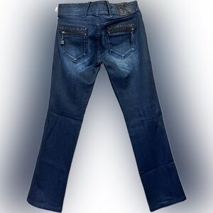 Express Rerock straight leg jeans. Cotton and spandex with stretch. Previously tailored leg hems. See measurements. Dark blue rinse denim. Back pockets have zippers and sparkle.