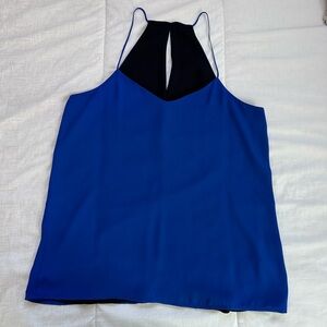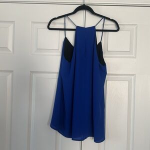 Barcelona Cami from Express. Reversible Blue and black, measures approximately 20 inches armpit to armpit and approximately 26 inches shoulder to hem on the front and 30 inches on the back. Doesn’t have a size tag but it’s a size large