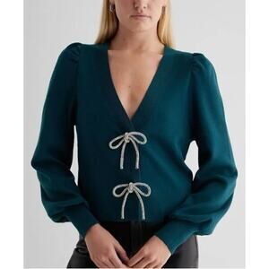 Express Rhinestone Bow Cardigan Sweater Dark Green Puff Sleeve Party Holiday XL