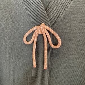 Dark green and silver Rhinestone Bow Cardigan sweater by Express. Puffed shoulder long sleeves, snap button closures. Excellent pre-owned condition. Bust across the front area measures approx. 22 inches (unstretched).