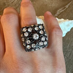 Express Rhinestone Cocktail Ring. Gunmetal. Brilliant rhinestones set in a filigree square. 3/4”. Size 5. New without tags. Never worn. Pretty!