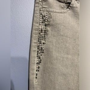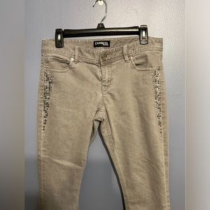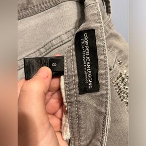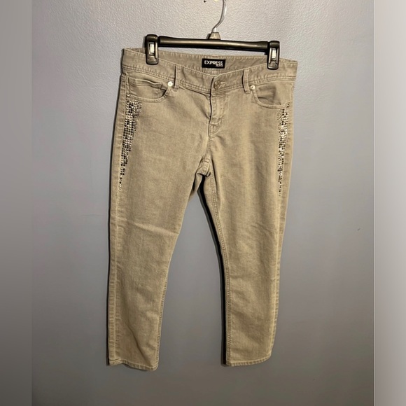 Slightly worn Express Jeans in women size 8. They are cropped leggings with inseam of 24. Missing one rhinestone that is seen in 3rd photo. No stains or rips.