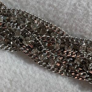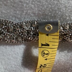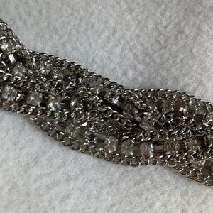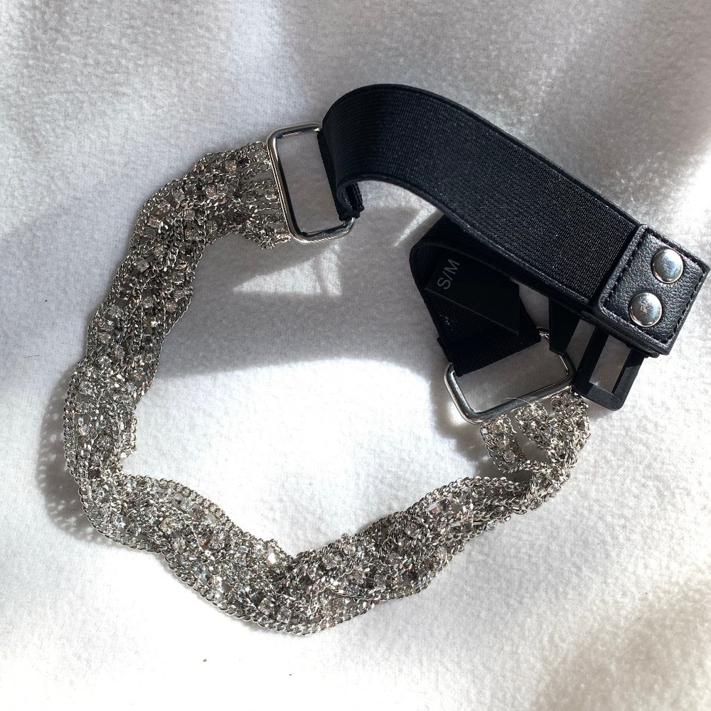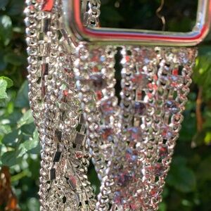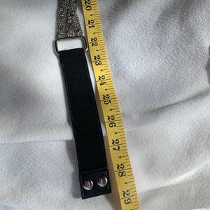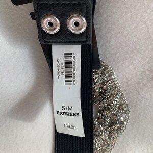 Clear color rhinestone and silver tone metal stretch belt by Express. Two snaps at the back, black elastic on both sides of the rhinestone front. Great condition, new with tags. 28" tight if not stretched, gives about two inches more comfortably. One inch wide.