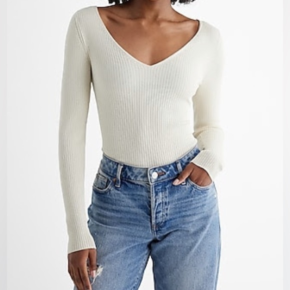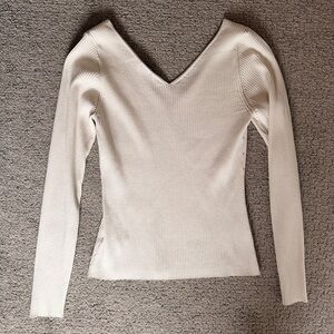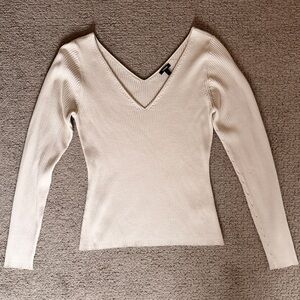 Stylish silky soft fitted cream ribbed double v-neck sweater. Versatile and chic.