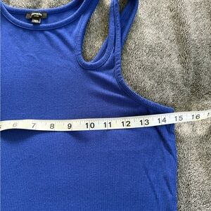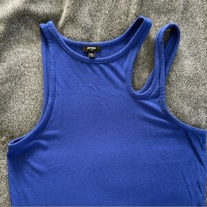 Comfortable royal cobalt tank with a stylish asymmetric shoulder strap. Smooth, stretch fabric offers a flattering, close fit. Versatile sleeveless silhouette perfect for layering or wearing solo.