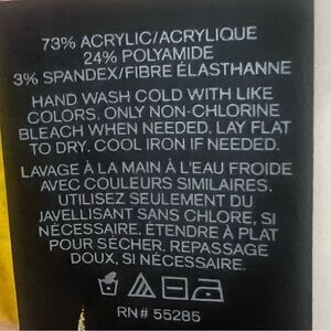 Features: 73% acrylic, 24% polyamide, 3% spandex. Cozy ribbed knit. Fringe at ends. Colorblock striped pattern. Yellow/burgundy combo. Hand wash or machine wash cold, delicate cycle. Dangle Express Logo.