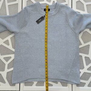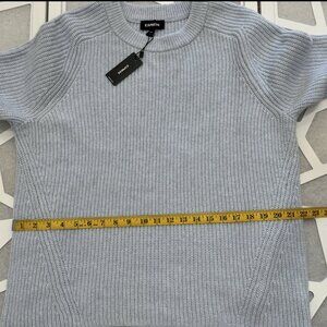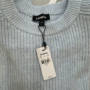 Brand new with tags, this light blue Express sweater features a classic crew neckline and a soft, ribbed knit texture throughout. The sweater has a relaxed fit with raglan-style sleeves and subtle seam detailing along the sides for added shape.