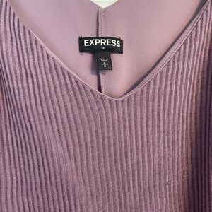 Purple midi dress, falls above the knee, ribbed. It’s lined but the lining stops under the booty for a fun sheer bottom. Adjustable straps.