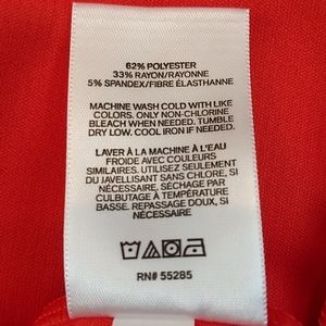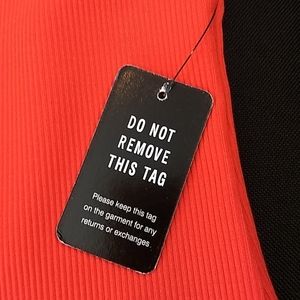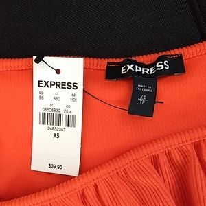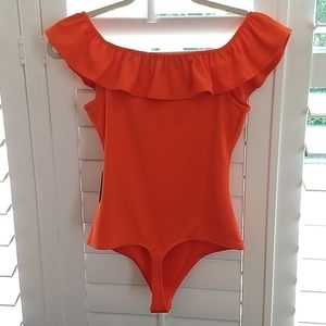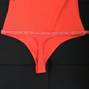 Express Bodysuit is ribbed and is worn off the shoulder. It has a ruffle neckline. It has a thong back with snap closures. Please see photo for approximate measurements. A photo of fabric contents is included. The color is called Bold Orange. I had trouble with my lighting and in some photos it looks more red. The color was hard to photograph. It is a bold orange color. It is an Express XS.