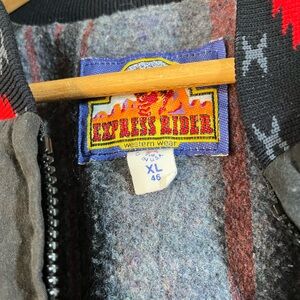 Bold bomber jacket with striking red native/ southern pattern accents. Features unique patterned details. In good condition. Has small hole in right armpit. Size is XlL in kids.