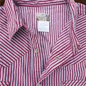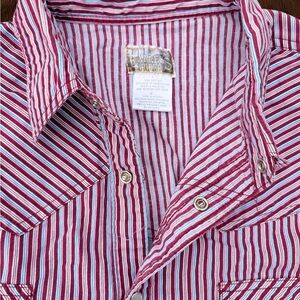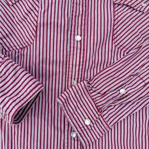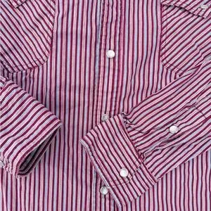 Classic Wrangler shirt with red and white stripes. Button-down style with chest pockets. Ideal for casual wear.
