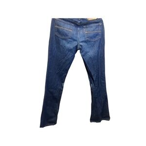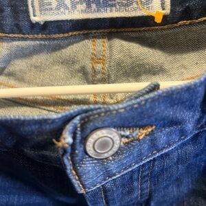 These Express Riot Siren jeans feature a flattering precision fit in a classic bootcut style. Made of 100% cotton for a structured, vintage feel. Medium blue wash with light fading and whiskering. Size 8L. Small wear spot on the lower leg shown in photos—priced accordingly.
