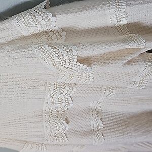 Color reminds me of french vanilla ice cream. Scalloped lace trim. Oversized. Heavy fabric and does stretch. Soft girl, feminine, girly, sweet, twee, weekend, hang out, dainty, frilly, demure, fall, autumn