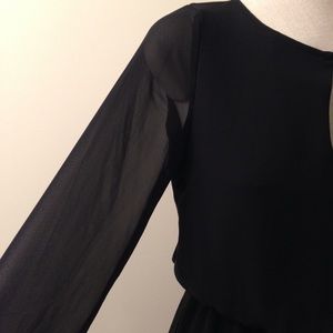 This romper is super cute throw on for an evening out. It has a sheer outer layer, but is lined everywhere except the arms. It features a key hole detail on the front and a cross over detail on the back. Add a pair of heels and clutch and you will be dressed to impress. Only worn once.