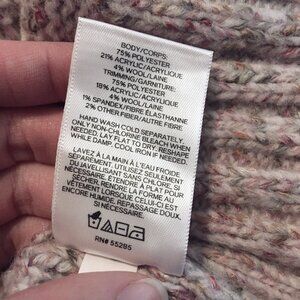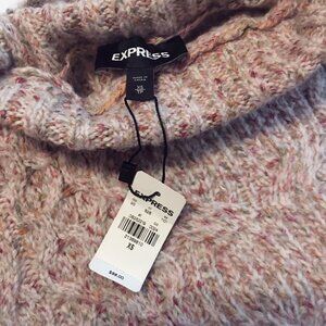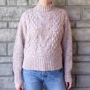 A beautiful, new with tags, pullover sweater from Express! Cable knit, semi-cropped length, with a mock neck and wide, tapered sleeves. The dominant yard color is a sort of neutral cream, with flecks of color in an 'autumn leaves' palate-- red, orange, pink; (it's a heathered/ marled knit). From a distance the sweater overall looks like a pale rose gold/mauve. Fabric is nice and plush! Thick, soft, & cozy!