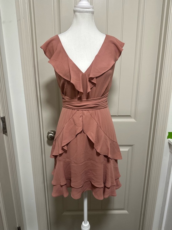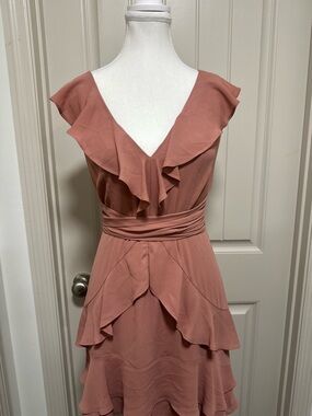 Soft rose-pink mini dress with layered ruffle details. V-neckline and flutter cap sleeves. Ruched waist for a flattering shape. Flowy tiered skirt adds movement.