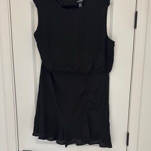 This fun mini dress features a crew neckline, strong shoulders, a relaxed bodice, ruched front skirt, and a ruffle hem. Style for work, an event, or a date.