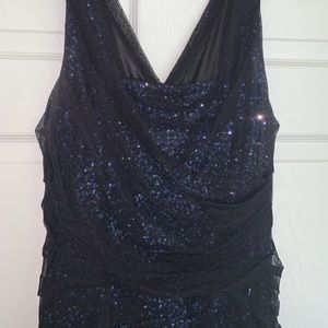 This stunning Express gown features a royal blue sequined gown with black mesh ruching overlay. The dress hugs in just the right places to define a nice bust, elevated waist, curvy hips, and long legs. It is made of 100% Nylon overlay and underlay with a 100% Polyester lining. This dress features a scoop neck front and v-neck back. It also has a hidden zipper in the center of the back. Wear it out on the town, a bachelorette party, NYE, semi-formal wedding, a fancy dinner. EUC. Sad to see it go!