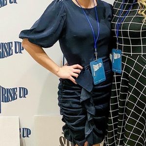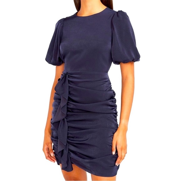 Navy blue ruched dress, sleeves are a little puffed out. There’s a ruffle detail on the skirt part of the dress. Worn only a handful of times. In perfect condition