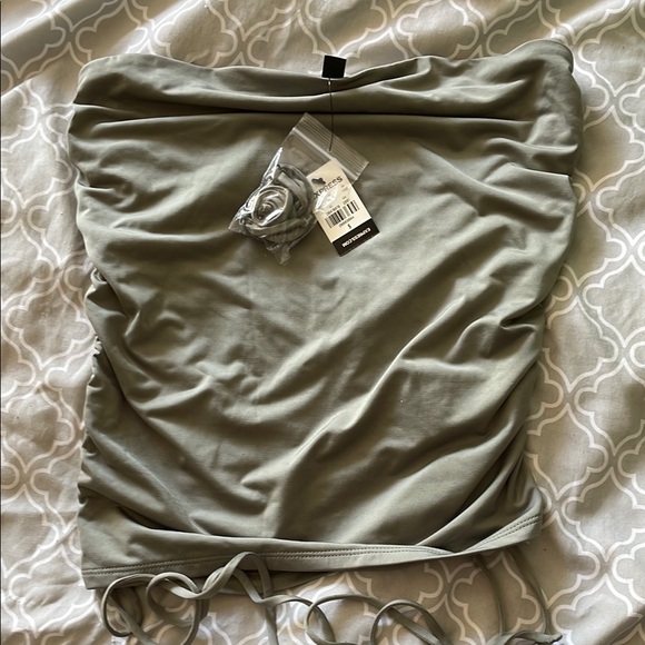 Stylish olive green tube top from Express. Features ruched sides and tie details. Perfect for casual outings.
