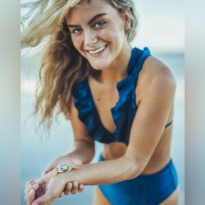 Stylish blue bikini top. Features ruffle details. Perfect for beach days.