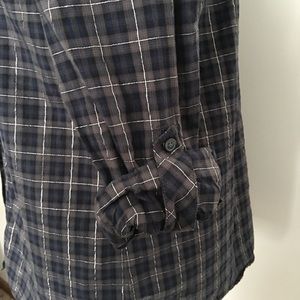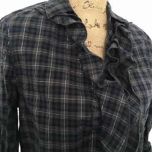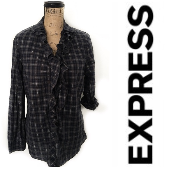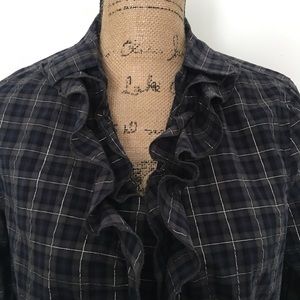 Pretty v-neck ruffled plaid blouse by Express. Sleeves can be rolled up and buttoned for a 3/4 sleeve. Like New Condition!!