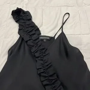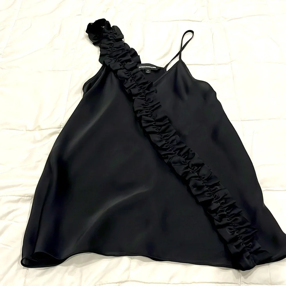 Cami with ruffle sleeve that runs diagonal over cami. Other sleeve is spaghetti strap. Not lined and slightly sheer. 100% polyester