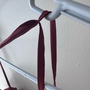 Chic burgundy camisole with ruffle details. Perfect for stylish outings. Color is in between a deep burgundy and a burnt orange. Perfect for fall! Straps faux tie together. Does not come untied!
