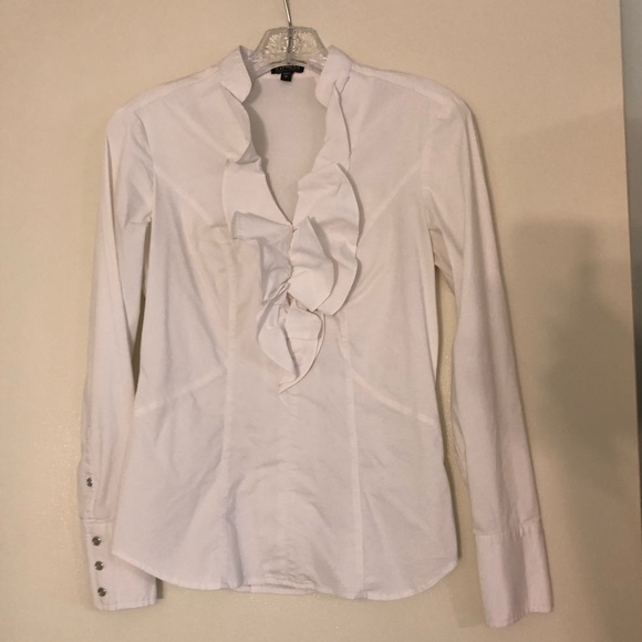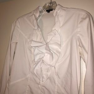 Elegant ruffle front white top by Express. Perfect for either a formal occasion or business meeting.
