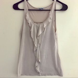 Pretty ruffle front & mesh keyhole! A cool toned off-white/grayish cream (maybe “pebble”) color that pairs well with almost any bottoms. Ruffling along the neckline, down the front, and a small mesh keyhole insert. Great for work or a night out. Only worn and washed a few times, just doesn’t fit me anymore! Smoke free/pet friendly home.