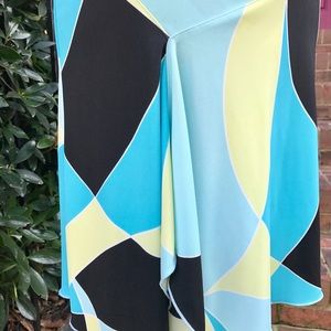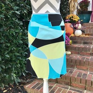 Flowing elastic waist knee length skirt. Has a ruffle gathering at the right thigh, flirty yet classy